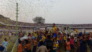 श्री नेताजी तरुण मंडळ आयोजित “चंद्रकांत चषक” स्पर्धेतील शनिवारी (दि.15 एप्रिल 2023) झालेल्या अंतिम हाय व्होल्टेज सामन्यात “पीटीएम”ने पारंपरिक प्रतिस्पर्धी “शिवाजी मंडळ”वर 3 – 1 गोलने मात करून चषकावर “कब्जा” केला. सामना जिंकताच पीटीएम समर्थकांनी शाहू स्टेडियम प्रेक्षक गॅलरीमध्ये आपल्या संघाचा झेंडा फडकवत “नाद खुळा .. पिवळा निळा …” असा एकच जल्लोष केला. मैदानावर खेळाडूंनी तर प्रेक्षक गॅलरीत समर्थक व फुटबॉलप्रेमींनी साऊंड सिस्टिमवर ठेका धरला. तसेच खेळाडूंनी समर्थक प्रेक्षकांच्या जल्लोषाला दाद दिली.