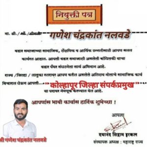 “वडार पँथर संघटने”च्या कोल्हापूर जिल्हा संपर्क प्रमुखपदी गणेश नलवडे यांची निवड झाली. या निवडीबद्दल त्यांचे मित्रपरिवाराकडून अभिनंदनाचा वर्षाव करण्यात आला.