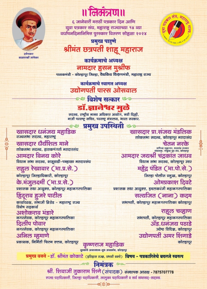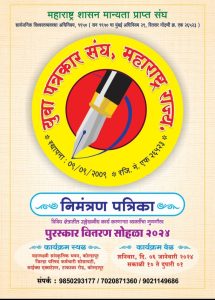 शनिवार दि. 6 जानेवारी 2024 मराठी पत्रकार दिन आणि युवा पत्रकार संघ महाराष्ट्र राज्यचा 14 वा वर्धापन दिन याचे औचित्य साधून “पुरस्कार वितरण सोहळा 2024” चे आयोजन करण्यात आले आहे. या पुरस्कार वितरण सोहळ्यात हा विशेष सत्कार करण्यात येणार आहे.