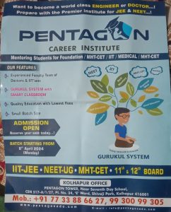 तीन वर्षांपूर्वी, 2021 मध्ये, कोल्हापुरात पेंटागॉन इन्स्टिट्यूटची स्थापना करण्यात आली. पेंटागॉनमध्ये विद्यार्थ्यांसाठी गुरुकुल प्रणालीची संकल्पना मांडली जाते. पेंटागॉनमधील सर्वांसाठी गुरुकुल शिक्षण प्रणाली हे एक प्रेमळ स्वप्न आहे. पेंटागॉन च्या गुरुकुल प्रणालीने कोल्हापुरात अल्पावधीत यशस्वी विद्यार्थ्यांचा पाया रचला असून पालकांच्या पसंतीला उतरणारे एकमेव इन्स्टिटय़ूट बनले आहे. अशी माहिती डायरेक्टर राजेंद्र कोरी यांनी पत्रकार परिषदेत दिली.